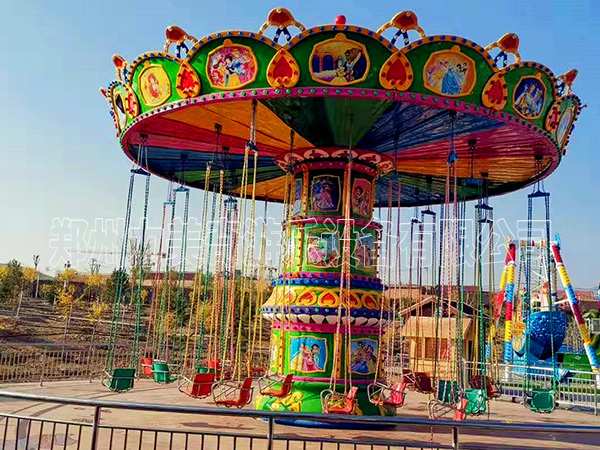 豪華飛椅是一種新穎飛行塔類游樂設(shè)備。立柱作公轉(zhuǎn)運動,頂部大轉(zhuǎn)盤上升、傾斜、搖擺式反方向自轉(zhuǎn)運動,使得環(huán)鏈懸掛的乘客,在離心力的作用下起伏飛旋,三種疊加運動的結(jié)合,猶如芭蕾綻放,又如銀燕在睛空中飛舞。夜幕降臨,搖擺旋轉(zhuǎn)傘與城市霓虹交輝相應(yīng),疑是一道城市彩虹。游客乘坐在垂掛的吊椅上,隨轉(zhuǎn)盤的轉(zhuǎn)動而徐徐升起,仿佛在高空中飛舞翱翔,由于轉(zhuǎn)盤的升高,垂直柱頭角度漸漸偏轉(zhuǎn),使游客猶如置身于波濤起伏的大海中其樂無窮,再加上豪華靚麗的外觀裝飾,令人耳目一新,在運動中使圍觀之人眼花繚亂,直想一試為快,真是游樂園的亮點。