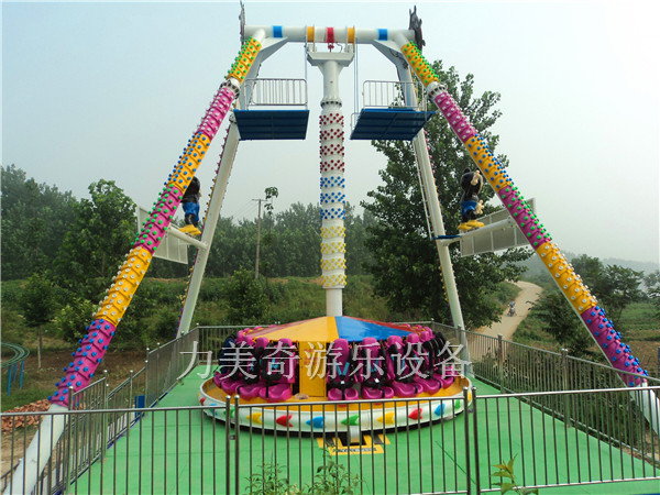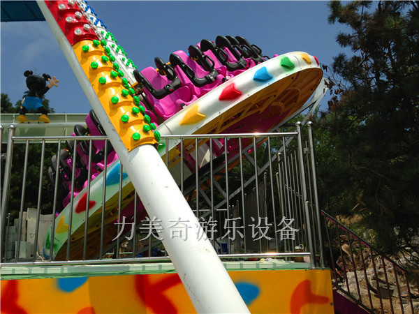 大擺錘又叫流星錘、大擺錘,是一種旋轉(zhuǎn)類的大型游樂(lè)設(shè)備,其運(yùn)動(dòng)原理是由時(shí)鐘鐘擺引發(fā)而來(lái),運(yùn)動(dòng)軌跡也是鐘擺形式,大臂下面帶有一個(gè)圓盤,在大臂做鐘擺擺動(dòng)時(shí),大臂下面的圓盤同時(shí)在做旋轉(zhuǎn)運(yùn)動(dòng),游客乘坐在旋轉(zhuǎn)的大擺錘上往復(fù)擺蕩,失重感令人目眩神迷;游客往往情不自禁的發(fā)出驚呼與歡笑,極大的提高了整個(gè)游樂(lè)場(chǎng)的歡樂(lè)氣氛,使許多游客留連忘返,遲遲不愿離去。