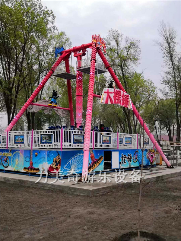 大擺錘是一種大型的游樂(lè)設(shè)備,常見于各大游樂(lè)園。游客坐在圓形的座艙中,面向外。大擺錘以壓肩作為束縛,配以帶作為二次保險(xiǎn)。座艙旋轉(zhuǎn)的同時(shí),座艙下面的推力器推動(dòng)著圓盤做單擺運(yùn)動(dòng)。大擺錘的運(yùn)行可以使置身其上的游客驚心動(dòng)魄。大擺錘屬于刺激型的大型游樂(lè)設(shè)備。