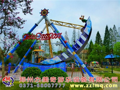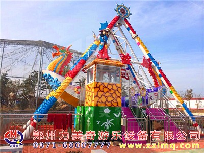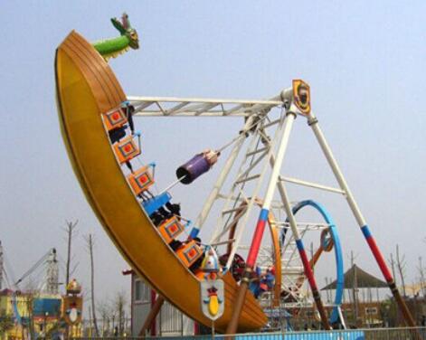 兒童游樂設(shè)備海盜船是一種全新設(shè)計的觀覽車類游藝機(jī),是一種繞水平軸往復(fù)擺動的游樂項目,該種游藝機(jī)因造型圖同而名稱各異,“海盜船”因為其外形仿古代海盜船而得名。海盜船造型為美洲印第安部落風(fēng)格,總高度7.2米,大擺角45度。