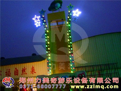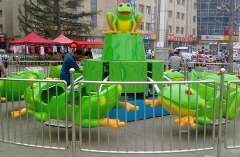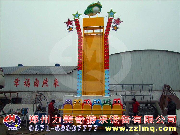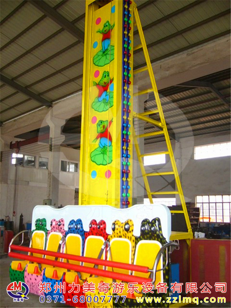 ”青蛙跳“游藝機(jī)是屬于一種勻速升高、分段下降的游樂設(shè)備,設(shè)備配有六個座位。操作人員待游客坐好后,扣好帶、桿,游客升高到高度,然后會跳躍式分段下降,猶如坐在大青蛙的背上蹦蹦跳跳的感覺。深受游客的喜歡,特別是青少年游客的喜愛。