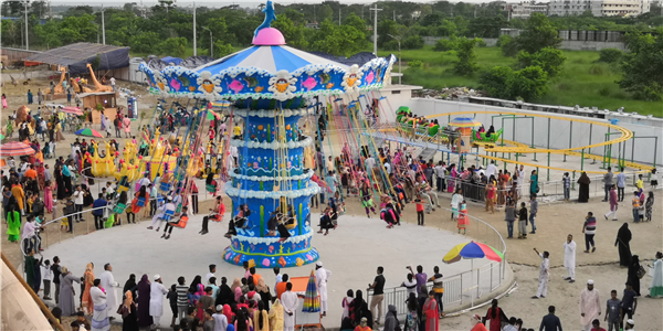 颶風(fēng)飛椅轉(zhuǎn)動時,乘坐在吊椅上的乘客猶如在藍天飛舞,體驗刺激收獲快樂。颶風(fēng)飛椅是集旋轉(zhuǎn)、升降、變傾角等多種運動形式于一體的大型飛行塔類游藝機。當(dāng)傘形轉(zhuǎn)盤和中間轉(zhuǎn)臺反向旋轉(zhuǎn)啟動時,塔身徐徐上升,此時轉(zhuǎn)盤搖擺,飛椅呈波浪蕩漾狀,游客猶如在空中飛翔、飄蕩,海闊天空、驚心動魄。設(shè)備巍峨雄偉,它柔和了絢麗的燈飾和七彩繽紛的圖案設(shè)計,造型華麗,是目前游樂場上漂亮、吸引人的游藝機之一,也是標(biāo)準(zhǔn)的主題公園或現(xiàn)代游樂場的選擇項目之一。