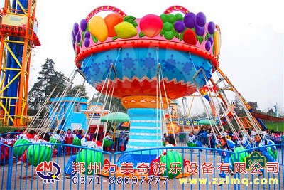 游樂場游樂設備西瓜飛椅是一款經(jīng)典的兒童飛椅,其靚麗的外觀和充滿刺激性的游戲形式備受大人和孩子們的喜愛。它的整體是以葡萄,芒果,草莓,桃子等 水果為造型,生動的刻畫加上艷麗的色彩讓整體的水果形象看起來更加的鮮艷欲滴,靚麗喜人。而且這種飛椅采用翠綠的西瓜造型為座艙,整體設計美觀大方,自然融為一體,看起來形象更加生動吸引人們?yōu)橹v足。飛椅設備周身配有許多燈光,極大的提升了設備的視覺效果和設備本身的吸引力!