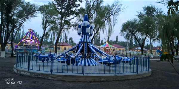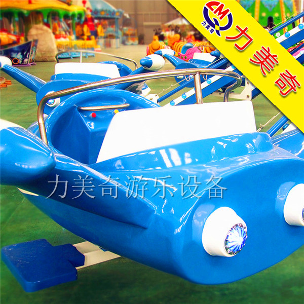 自控飛機(jī)游樂設(shè)備每個(gè)臂可以坐兩個(gè)人,乘客坐在座艙里可以控制按鈕來控制飛機(jī)上升下降,趣味無限,中央火箭、大臂及飛機(jī)座艙上配有彩燈,夜幕降臨,一架架載著閃亮燈光的飛機(jī)飛來飛去,絢麗多彩,吸引著來往游人的目光。