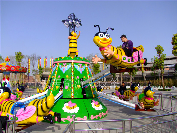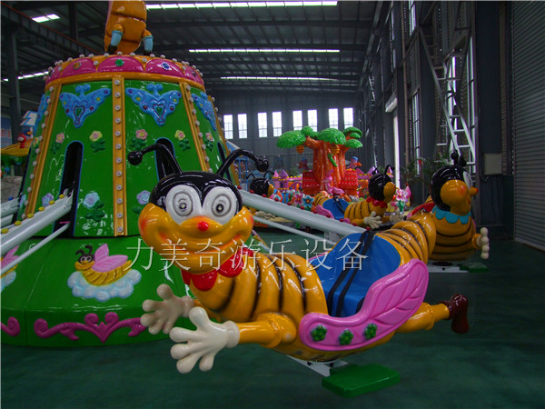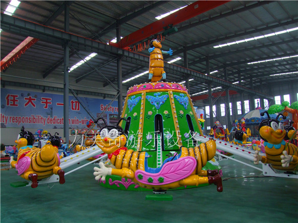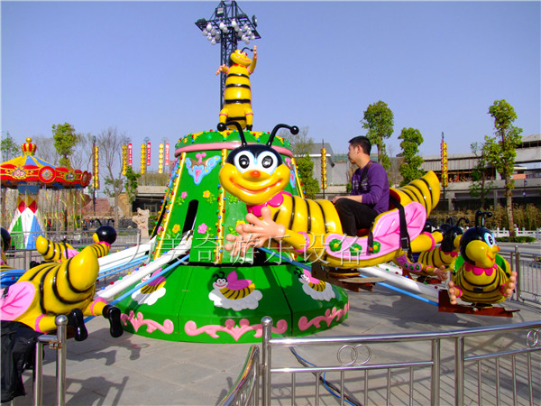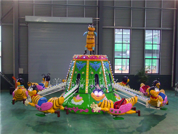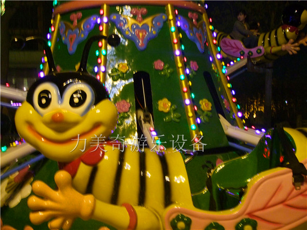 鄭州力美奇游樂生產(chǎn)的自控類游樂設備-自控小蜜蜂,由機械、氣動和電氣系統(tǒng)組成,是一種繞垂直軸中心旋轉(zhuǎn)、升降自由的小蜜蜂游樂設備。中間是大蜜蜂的造型,旁邊伸展出一個個小蜜蜂,小朋友坐在里面,配合著優(yōu)美的音樂和節(jié)奏,仿佛一個個駕駛員,乘坐著小蜜蜂翱翔在天空,保衛(wèi)著祖國和我們的家園。