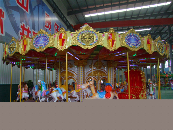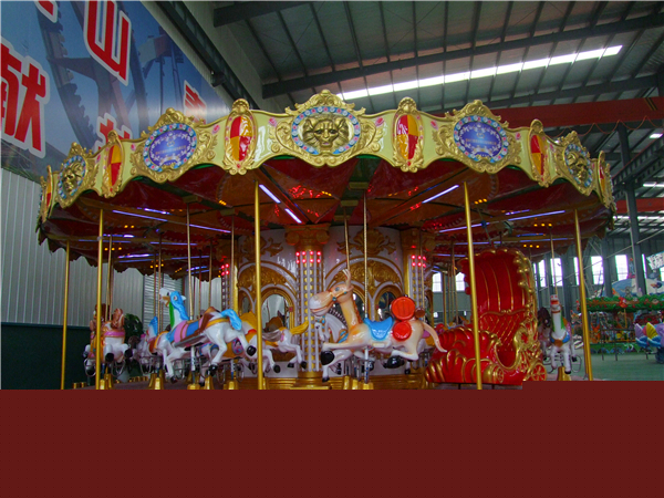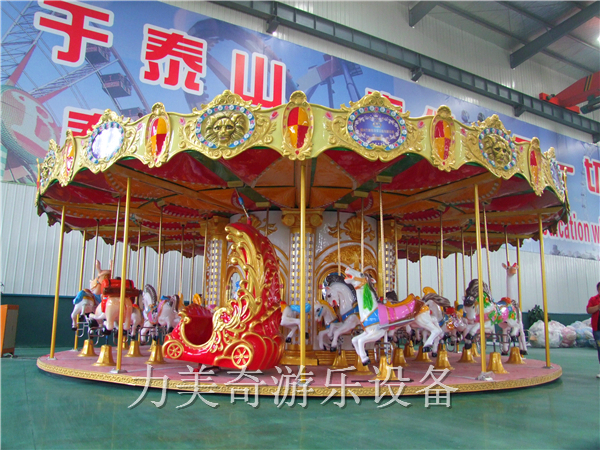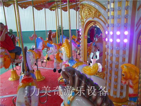 鄭州力美奇游樂設(shè)備有限公司生產(chǎn)的36座豪華轉(zhuǎn)馬,內(nèi)外頂棚及中柱都采用了玻璃鋼材質(zhì),由無數(shù)匹馬兒、豪華馬車、小驢、鴕鳥、長頸鹿、鴕鳥、獅子等動物組成,頂部有華麗無比的皇冠。當(dāng)夜幕降臨,五顏六色的燈光亮起,更顯現(xiàn)出它的豪華跟華麗,成為樂園很耀眼、受歡迎的焦點(diǎn)項目。