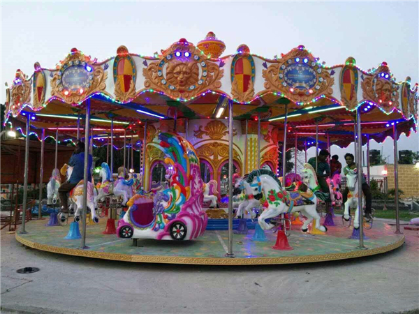 鄭州力美奇游樂(lè)設(shè)備有限公司生產(chǎn)的36座豪華轉(zhuǎn)馬,內(nèi)外頂棚及中柱都采用了玻璃鋼材質(zhì),由無(wú)數(shù)匹馬兒、豪華馬車、小驢、鴕鳥(niǎo)、長(zhǎng)頸鹿、鴕鳥(niǎo)、獅子等動(dòng)物組成,頂部有華麗無(wú)比的皇冠。當(dāng)夜幕降臨,五顏六色的燈光亮起,更顯現(xiàn)出它的豪華跟華麗,成為樂(lè)園很耀眼、受歡迎的焦點(diǎn)項(xiàng)目。